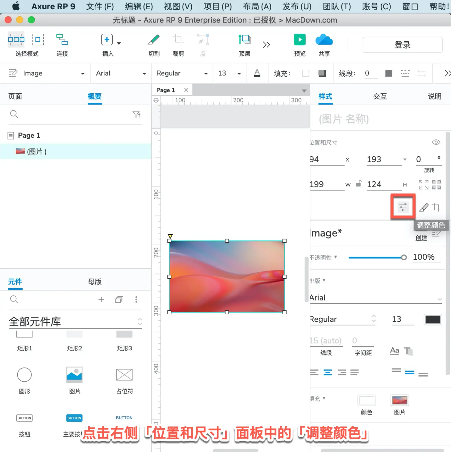 4、在软件中可以对图片的颜色进行,在“位置和尺寸”面板点击“调整颜色”。