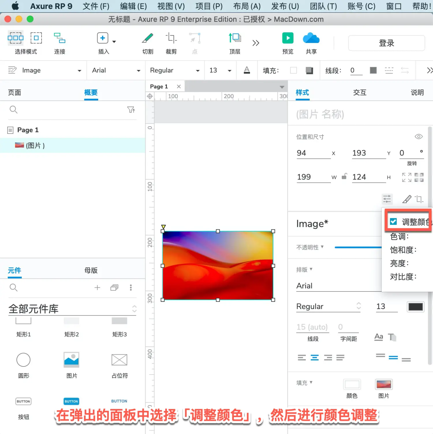 1、首先将“图片”元件拖到画布,双击图像元件导入图像。