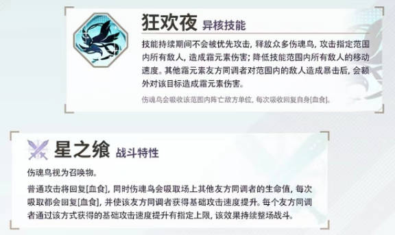 虽然她作为输出爆发力的角色,但召唤伤魂鸟是她的一个战斗特性,可以释放伤魂鸟吸取场上其他友方的生命值,获得回复血食,此外他们也会得到增益效果。这个战斗特性对敌方的输出和牵引都是值得一试的。