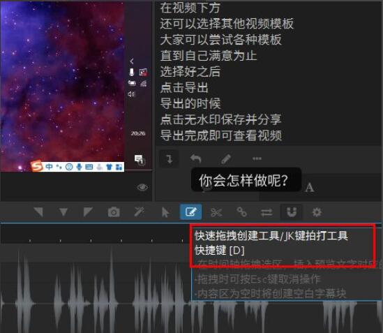 6、除了通过鼠标操作的方式添加字幕之外,我们还可以通过快捷键:按住键盘上的J键或者K键的方式来添加字幕。