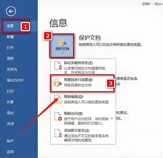 2、点击信息,在信息界面点击保护文档,接着点击下面的用密码进行加密。