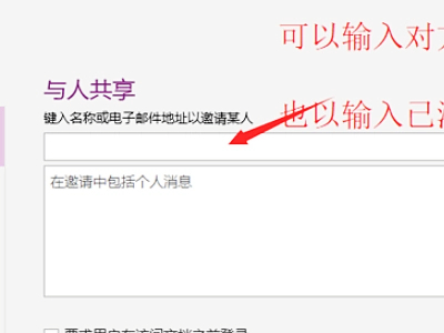 3、来到共享笔记本页面,如果想要私密共享,则点击与人共享栏,在右侧如图所示位置输入对方的Microsoft账号。