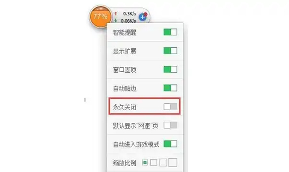 5、 进入360加速球设置界面后,找到“永久关闭”按钮,打开这个按钮即可关闭360加速球了。