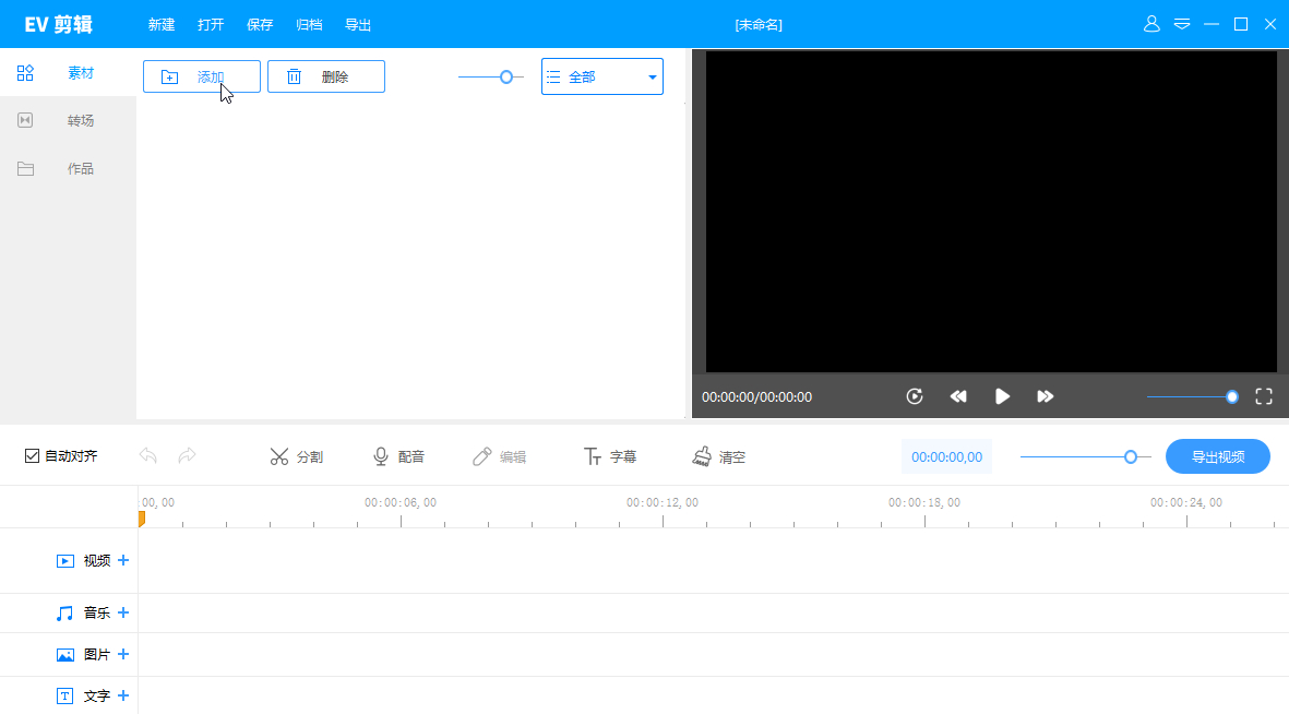 1、首先打开ev剪辑软件,点击“添加”按钮导入我们想要进行修改的视频;