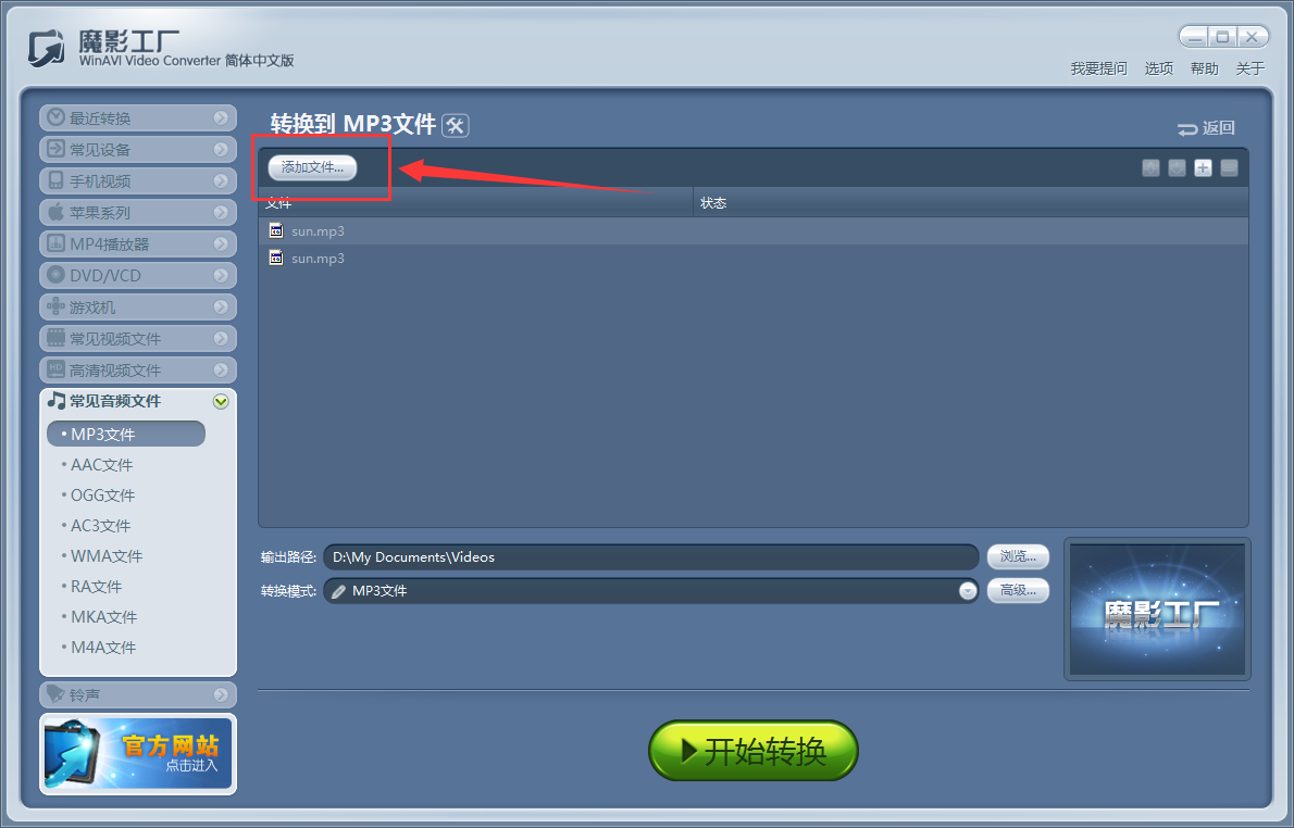 1、首先我们打开电脑上的魔影工厂软件,然后在其界面中间点击“添加文件”并把第一首需要合并的音乐添加进来;