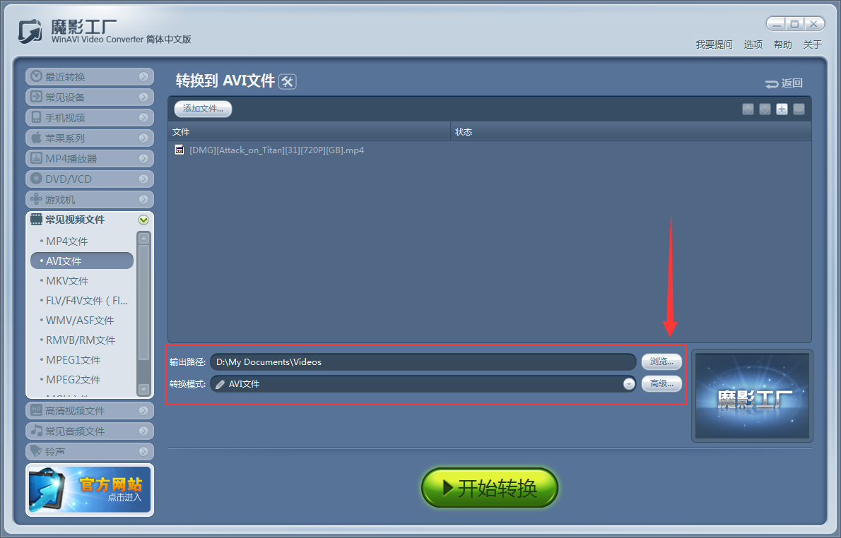 3、我们选择好输出格式后就会返回到魔影工厂界面,这个时候我们点击“浏览”选择输出视频的保存位置,选择完毕后点击“开始转换”即可;