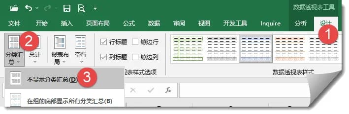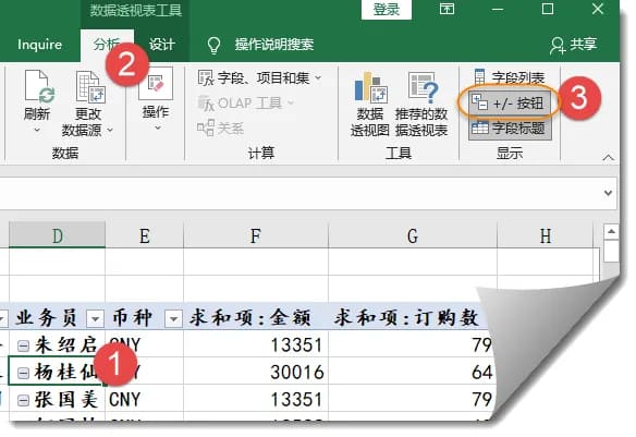 3.如果数据透视表中显示了折叠按钮,可在选项卡中点击将其隐藏,使报表更加简洁。