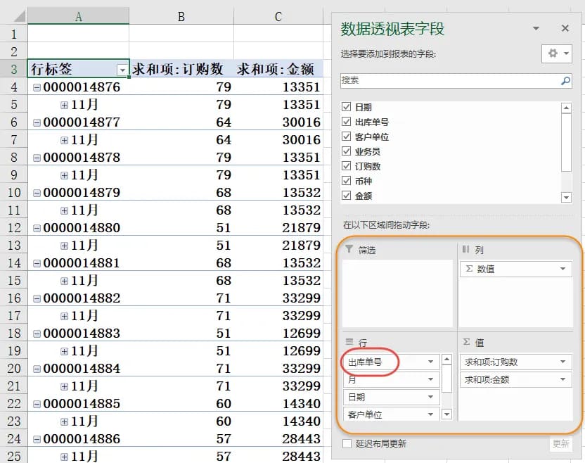在列表中,拖动各字段到相应区域,确保不重复的“出库单号”字段位于行区域的最上方,以便清晰展示数据结构。