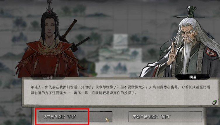 5.找到景弘的到师父明通之后,要去打一次火鸟,火鸟不会直接死亡,接着明通会放走火鸟,然后要一直追,到最后和明通对话,选择【朝三足乌投掷“锥阳”】。
