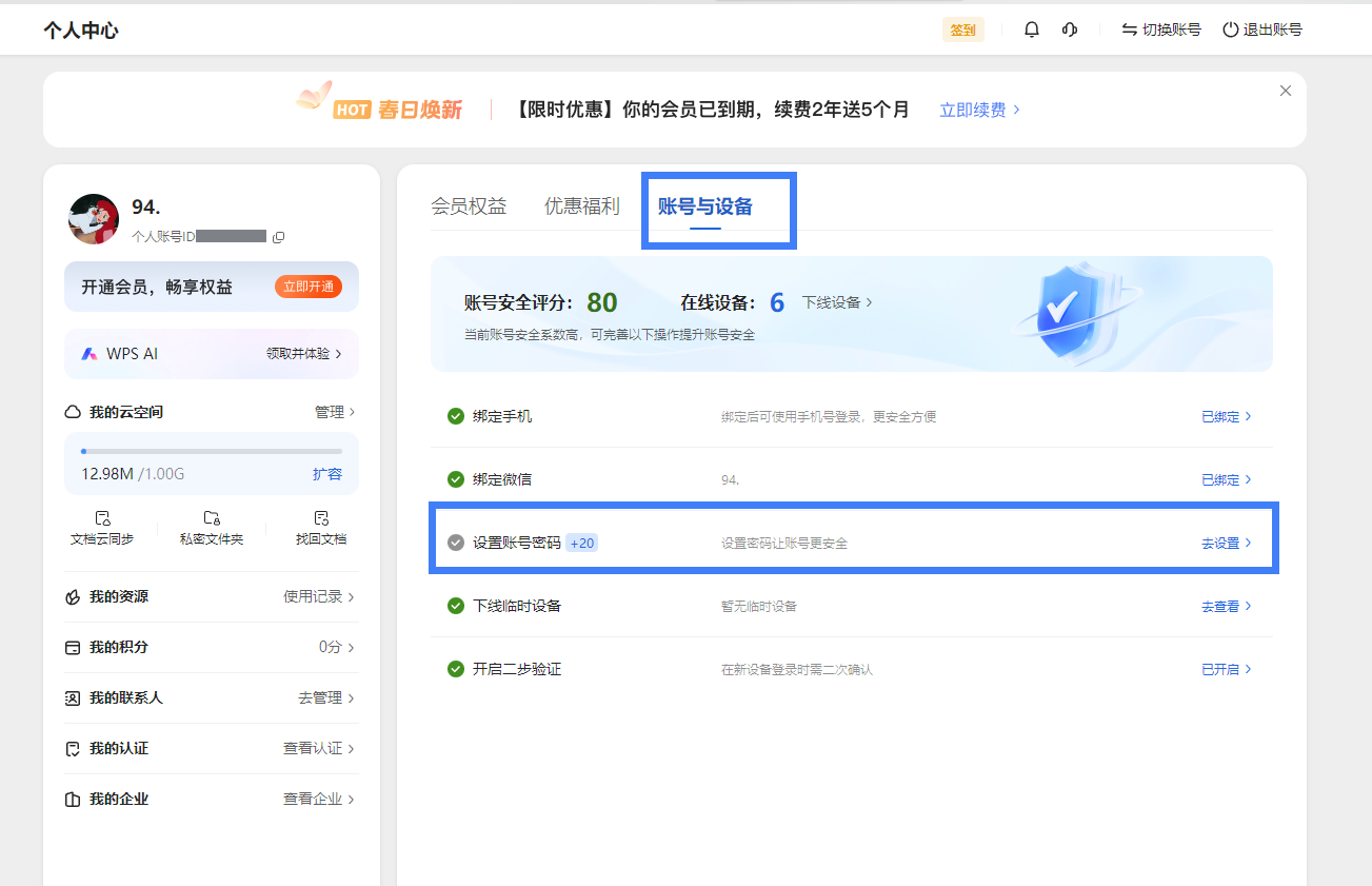 4.设置账号密码: 在账号与设备页面中,找到“设置账号密码”选项,并点击“去设置”。