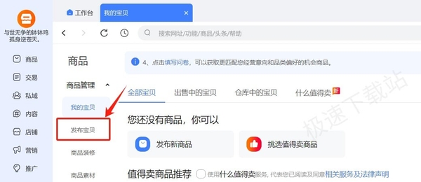 3.发布新品:在商品管理页面中,寻找并点击“发布宝贝”按钮,准备发布您的新产品。
