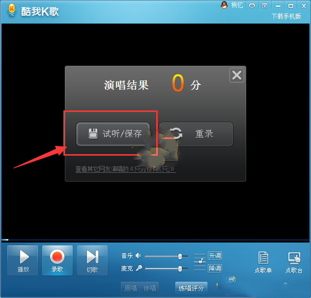 3.录制完毕,点击“停止录制”,并试听保存你的演唱。
