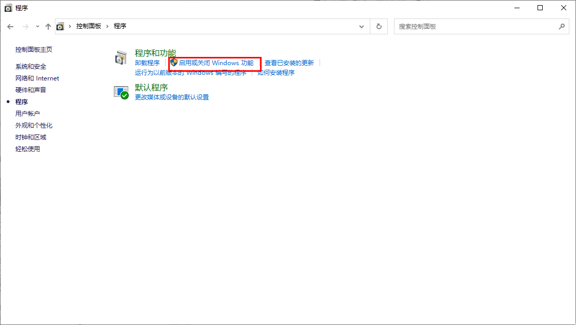 3.访问Windows功能:在“程序”选项界面,点击“启用或关闭Windows功能”。