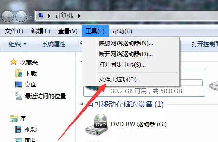 点击桌面或文件资源管理器中的工具选项,然后在下拉菜单中选择"文件夹选项"。