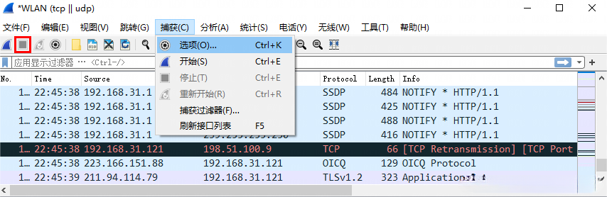 使用抓包过滤器前,需要先停止 Wireshark 的数据包捕获。