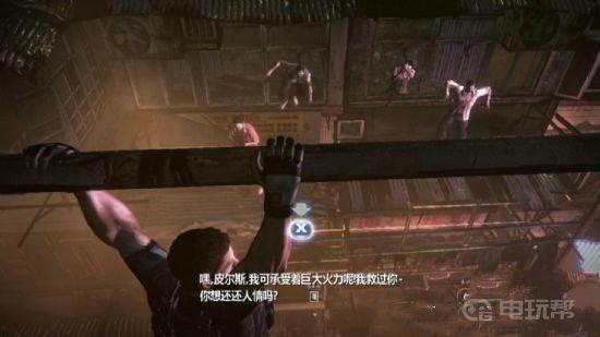 3、朝平台上傻愣的敌人点射,等他们都躺倒后攀爬扶梯来到对面建筑,这里需要握着竹竿到对面去,中途会有丧尸朝你射击,血槽清空后就会坠楼摔死,所以上去前先把药给嗑完。到达对岸后在皮尔斯的远距掩护下与敌人交战,飞蛾型的敌人射击它垂挂着的半个躯体,与皮尔斯回合后继续突围。