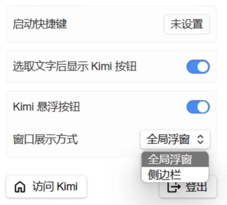 Kimi插件还贴心地提供了全局浮窗和侧边栏两种展示方式,用户可以根据自己的使用习惯和需求进行自由切换。通过简单的设置,即可在浏览器→拓展→Kimi浏览器助手→窗口展示方式中找到并调整至最适合自己的模式。