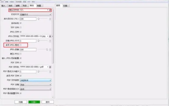 3.转到“输出”标签页,用户可以设置默认的保存文件夹路径,并勾选“多页JPEG格式”选项,这样连续扫描的图像就能被保存为一个多页文件。