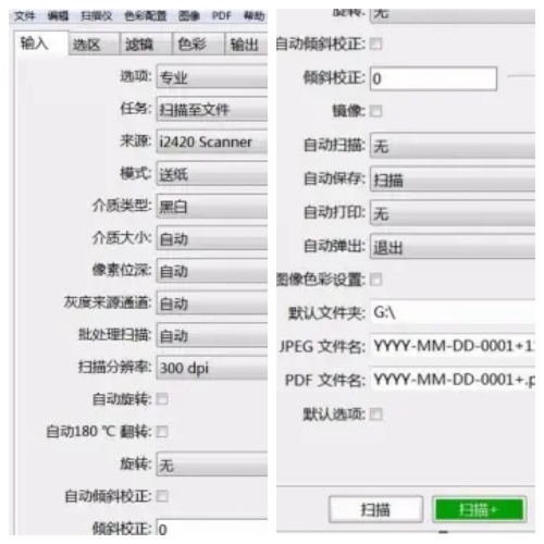 2.进入专业模式后,页面标签栏上方有6个分区,包括“选区”、“输入”、“色彩”、“滤镜”、“输出”和“预置”。对于扫描文件到PDF格式,需要用到设置“输入”和“输出”。