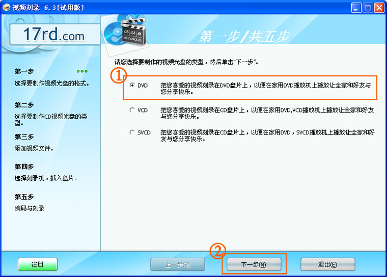 2.请根据您的需求选择想要制作的光盘类型,例如DVD光盘,然后点击“下一步”继续。