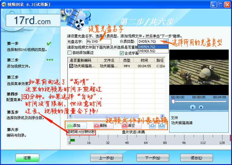 4.在此步骤中,您可以添加多个视频文件,为光盘命名,并选择光盘类型。此外,您还可以预览视频内容以确保一切正常。请注意,如果您的视频选择了“高清”模式,总时间不应超过150分钟;若选择“自动”模式,则时间没有限制,但长时间的视频可能会导致质量下降。设置完成后,请点击“下一步”。