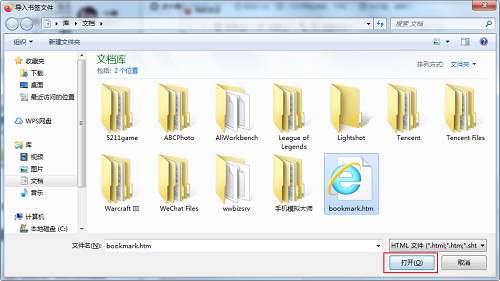 5、最后在弹出的窗口中选择需要导入的书签文件,点击打开按钮就可以成功导入了,如下图所示。