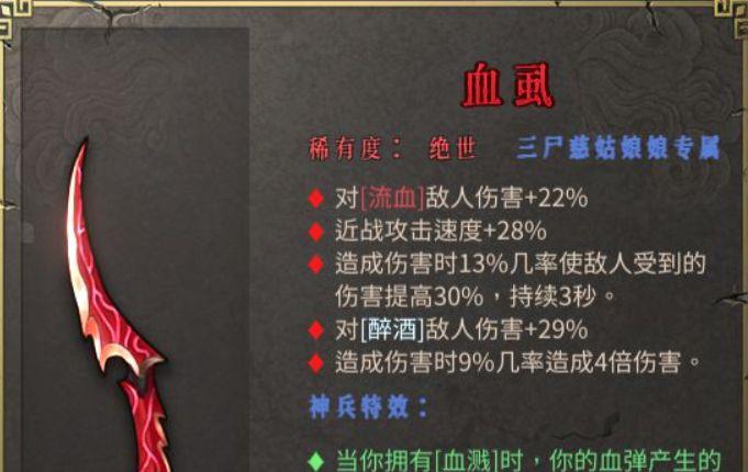 暖雪游戏中一共有六个佛像,分别是七剑修罗、无量尊者、神饮明王、圣威怒雷金刚、三川苦寒菩萨、三尸慈姑娘娘,每个佛像的专属武器都有两种,一共12把专属武器。下面是专属武器的图片。