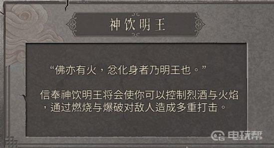 1、神饮明王可以让玩家拥有操纵烈酒和火焰的能力,玩家所有的攻击力提高10%,并且在攻击时有15%几率额外造成20%的火焰伤害。当普通攻击附带火焰时,则说明已经触发被动的火焰伤害。神饮明王有两种流派可以选择,分别未【酒染】和【醉歌】。