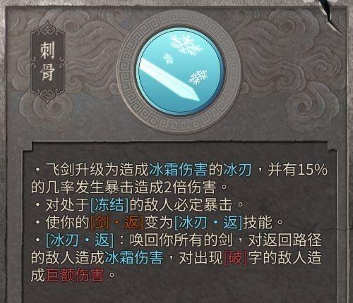 2、刺骨可以让玩家的飞剑改为造成冰霜伤害,并且有15%几率造成双倍伤害。冰霜飞剑对于冻结状态的敌人必然暴击。