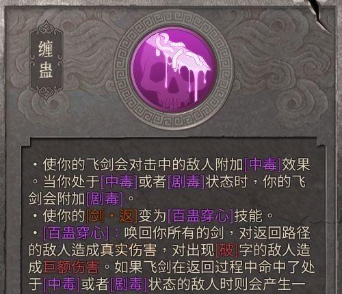 3、当玩家选择缠蛊后,会使飞剑附加中毒效果。剑·返会被百蛊穿心替换,召回飞剑时对敌人在造成真实伤害,并在命中中毒状态的敌人后产生毒爆。