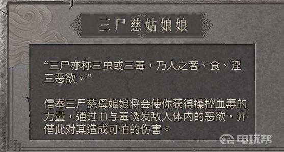 1、三尸慈姑娘娘需要玩家击败九只【噩兆降临】房间的怪物才能够解锁。三尸慈姑娘娘可以让玩家拥有控制血和毒的能力,在选择该宗派后玩家角色造成的流血和中毒最大效果可以叠加2层,并使玩家角色受到的中毒伤害降低50%。但玩家角色在生命值高于50%时,每12秒近战攻击都会使玩家进入中毒状态。三尸慈姑娘娘有【血溅】和【缠蛊】两种流派可以选择。