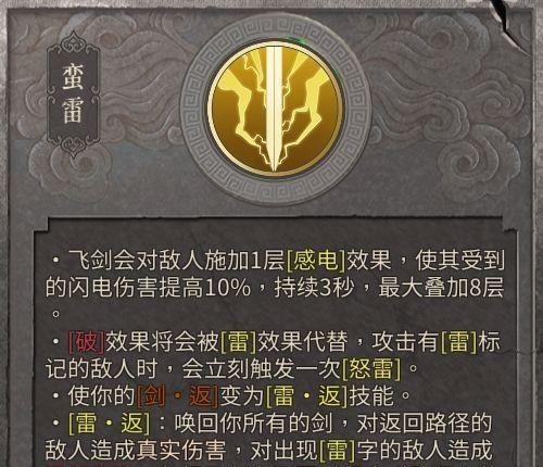 3、当玩家选择蛮雷流派后,飞剑可以对敌人附加感电效果。飞剑会附带闪电攻击,且【破】的效果会被【雷】替换,攻击带有【雷】标记的敌人会百分百触发闪电攻击。剑·返会替换为雷·返,对返回路径上的敌人造成真实伤害,并且为其附加两层感电效果。