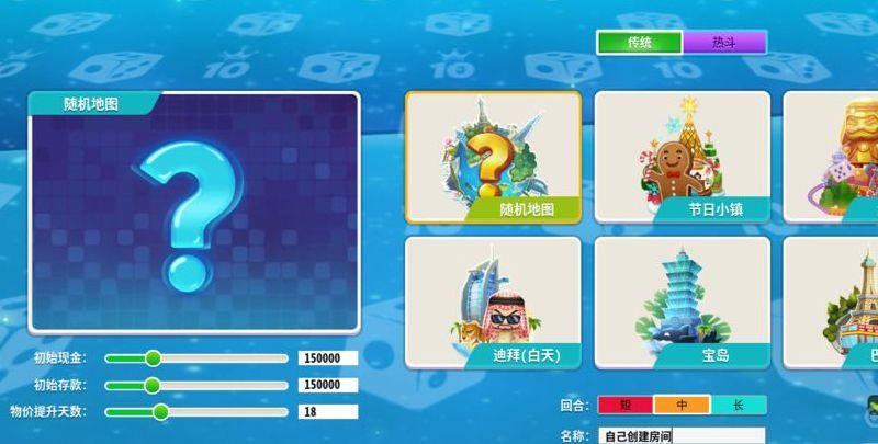 4.如果其它玩家的房间不合你的心意,玩家也可以选择创建房间。点击创建房间之后,选择自己想玩的地图、模式(传统和热斗模式)、回合时间(短期中期长期)、初始现金、初始存款、提升物价天数,同时可以为你建立的房间取个名字,以及设置密码,完成后就可以等待其它玩家或者邀请朋友一起游戏了。