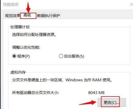 4、进入性能选项,点击--高级 再点击--更改