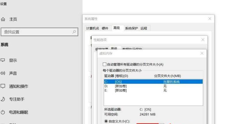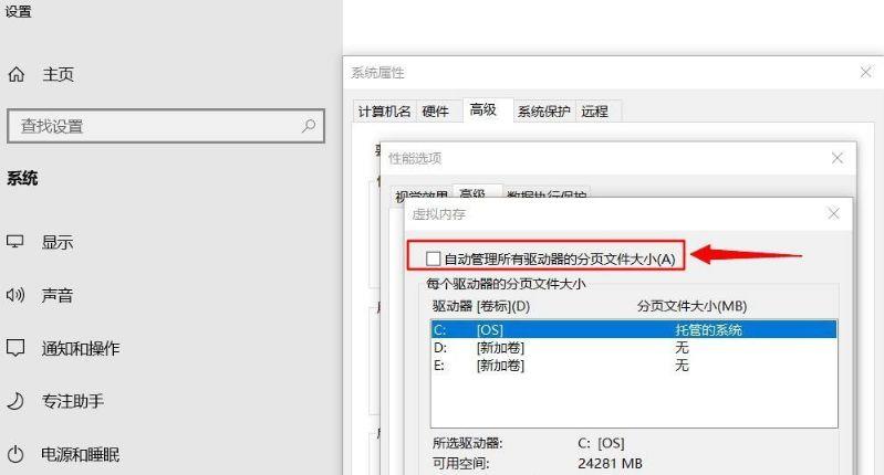 5、取消勾选--自动管理所有驱动器的分页文件大小,勾选--自定义大小