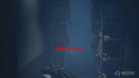 9.此时我们还无法对手造成伤害,只能快速移动来躲避手的追击,沿着货架上的铁网爬到上方,穿过管道即可暂时逃脱手的追杀。