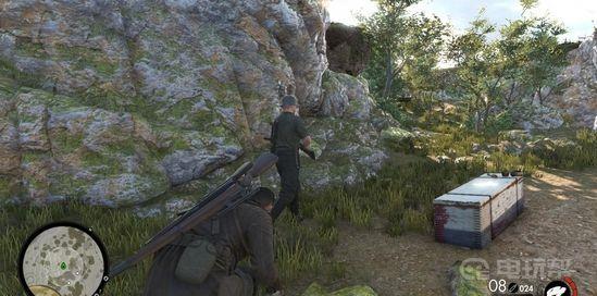 17、沿着海滩旁的路,可以经过一个山洞,山洞内会有两个没戴头盔的敌人,都可以用消音手枪杀死。