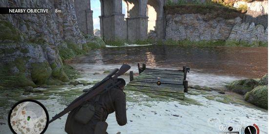 7、顺利的通过路口,按M打开地图,可以在地图上看到我们需要暗杀的目标。而在场景中按Tab键则能看到信息。前往缺口处,在这整个关卡中,需要利用好飞机飞过时制造的噪音,才能不被发现。匍匐在下图的位置,按B标记出正前方屋子内的目标,按Tab时显示为"Kill Officers"。等待飞机飞过,屏幕正上方出现信号标记时,将目标军官狙杀。