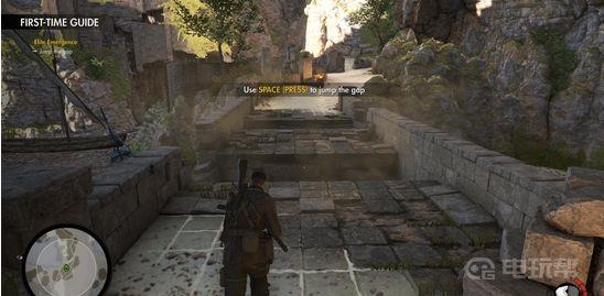 2、杀死敌人后,从柱子下方爬至上方平台,出现教程提示,按B打开望远镜将远处的两个敌人与1个吊钩标出,再按B退出望远镜。