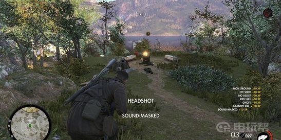 20、最后的木屋内有两个敌人,目标和敌人。在下图的位置等待目标前往至木屋左侧,翻过障碍,用近战杀死敌人。等待飞机飞过,用狙击杀死目标,别忘记将屋内的摄像机踹倒。