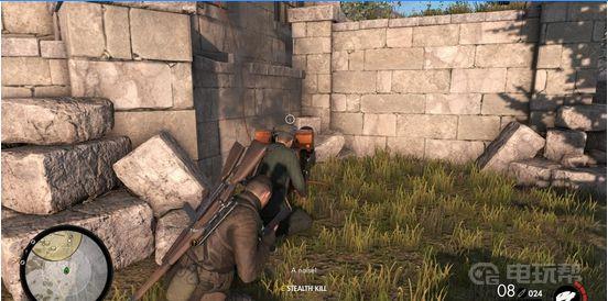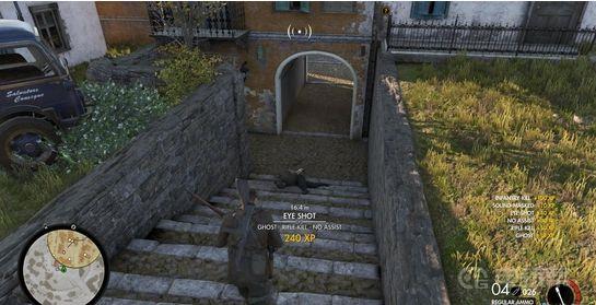 21、从山上下山抵达村庄。第一个要击杀的敌人在卡车旁,如果有飞机飞过,该敌人又往回走。可以从背后狙击直接杀死。将尸体藏在卡车附近或藏在前方左侧盲点。为的是不让正前方右转的敌人发觉。如果敌人已经过了阶梯,还是选择隐蔽,慢慢暗杀。
