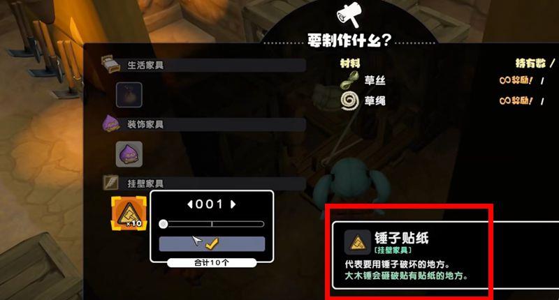 ①第二天,先去找老婆婆,制造可以控制大木锤帮忙砸墙的贴纸,然后在长椅上等待傍晚回到牢房。