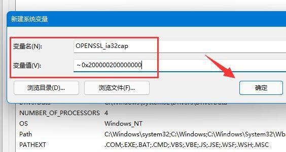 5、接着在变量名中输入“OPENSSL_ia32cap”,在变量值中输入“~0x200000200000000”并“确定”保存。