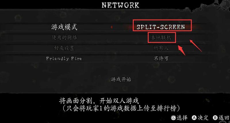 3.在网络选择这里,【游戏模式】选择分屏,【使用的网络】选择本地联机