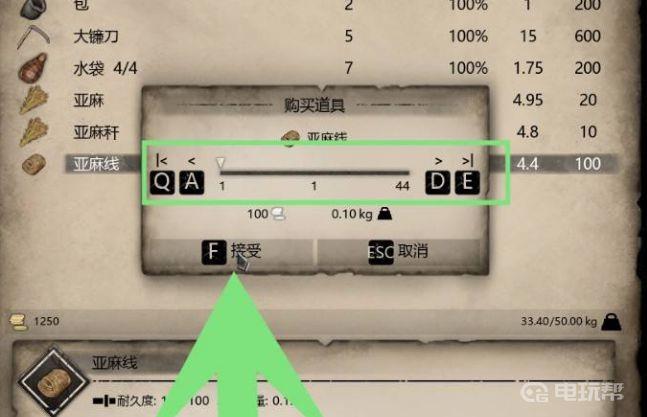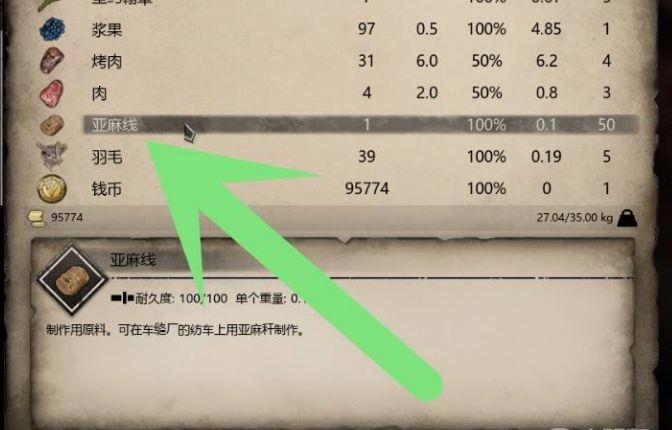 5、这时在货物列表里找出亚麻线,然后点击它,再按F键。