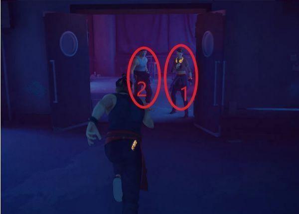 8、靠近门之前,门会打开,有两个敌人会出来,此时如果冲刺到这两人面前可以偷袭处决一个,建议处决女兵。左侧的背心男虽然比女兵难缠,但是有精英化的可能,因此推荐先处理1号。