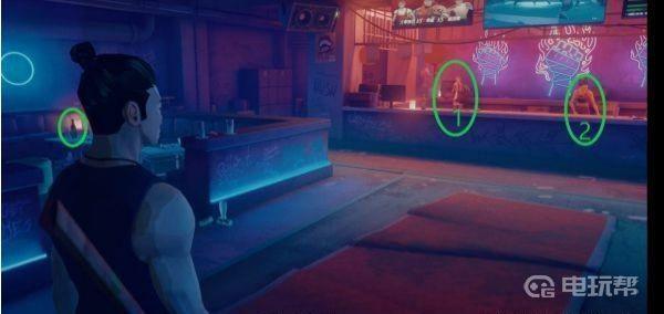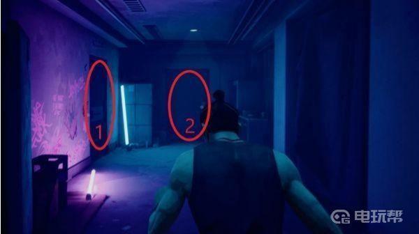 14、穿过两道门进入下一个场景。吧台后面是两个长腿,非常难缠。建议拿上左侧的酒瓶,投掷可偷袭处决2号敌人,最后使用专注技能秒杀1号敌人。拿上1号敌人左侧的钢制棒球棍,对下个场景非常有用。