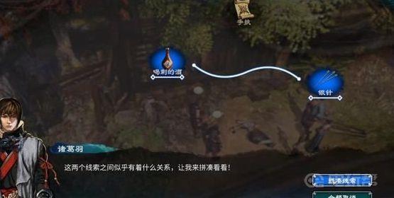 5、进入思考界面,拼凑喝剩的酒与银针,发现酒里的砒霜。