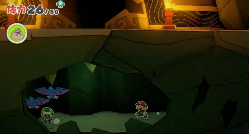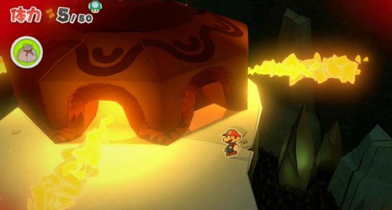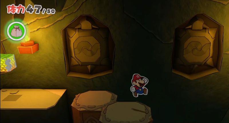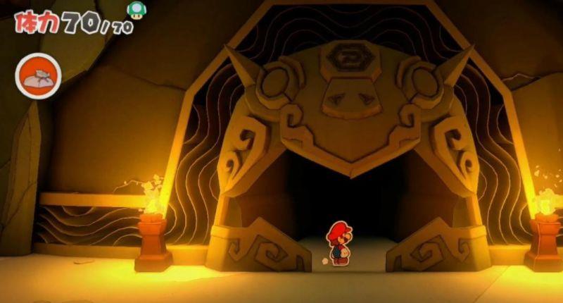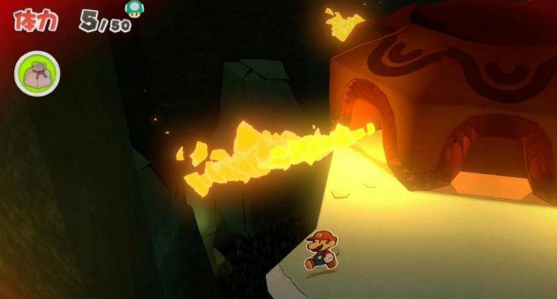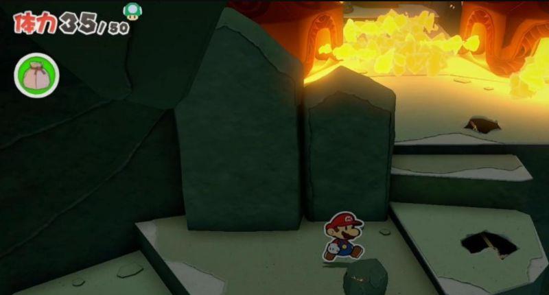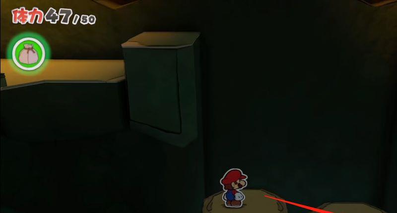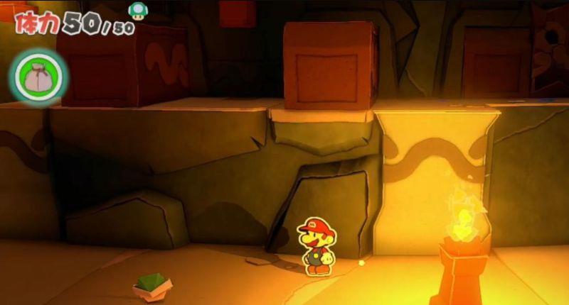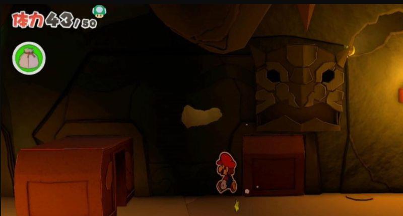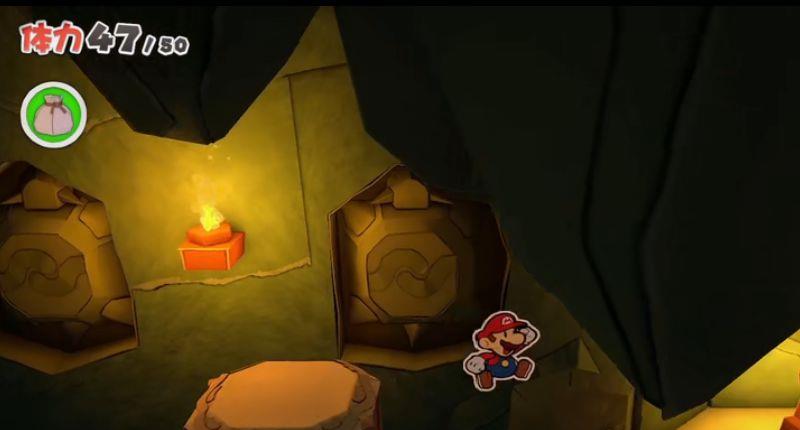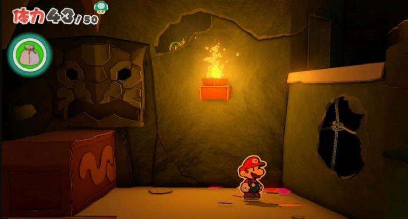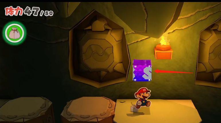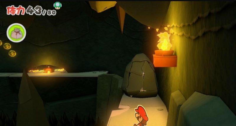 41、进入左侧道路后墙上有一个火焰机关,开始时可以直接通过火焰烧不到马力欧。在向前走到空心洞处准备修补之后机关会从墙上掉下来,找准时机进入洞口的位置即可。