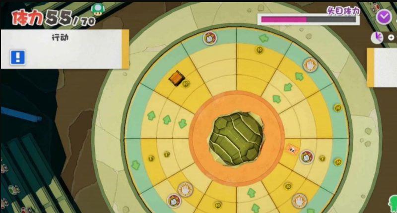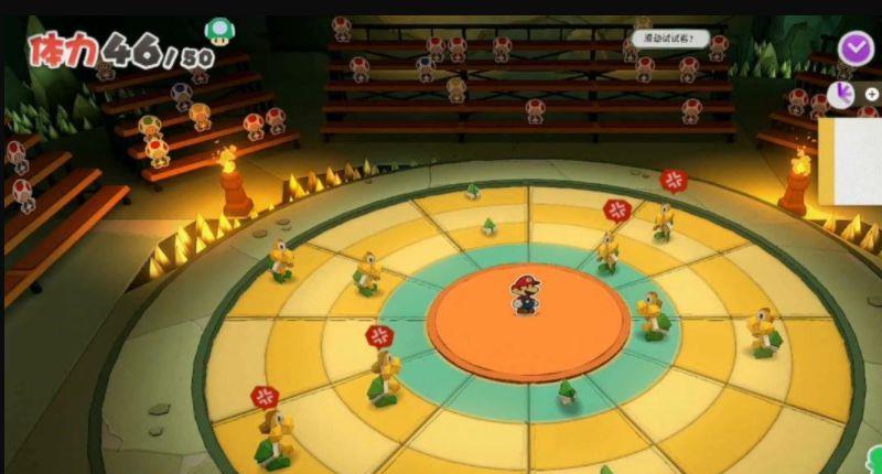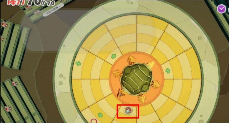 46、圆环中的方向箭头代表马力欧踩到该箭头后会前进的方向,红圈位置必须放置一个方向箭头,红框中的图标代表攻击位置,攻击四肢可以造成较多伤害,攻击尾巴可以造成最高伤害。转动或者滑动圆环将箭头连成一条路线,路线终点为攻击位置。来到位置之后使用道具攻击BOSS即可。